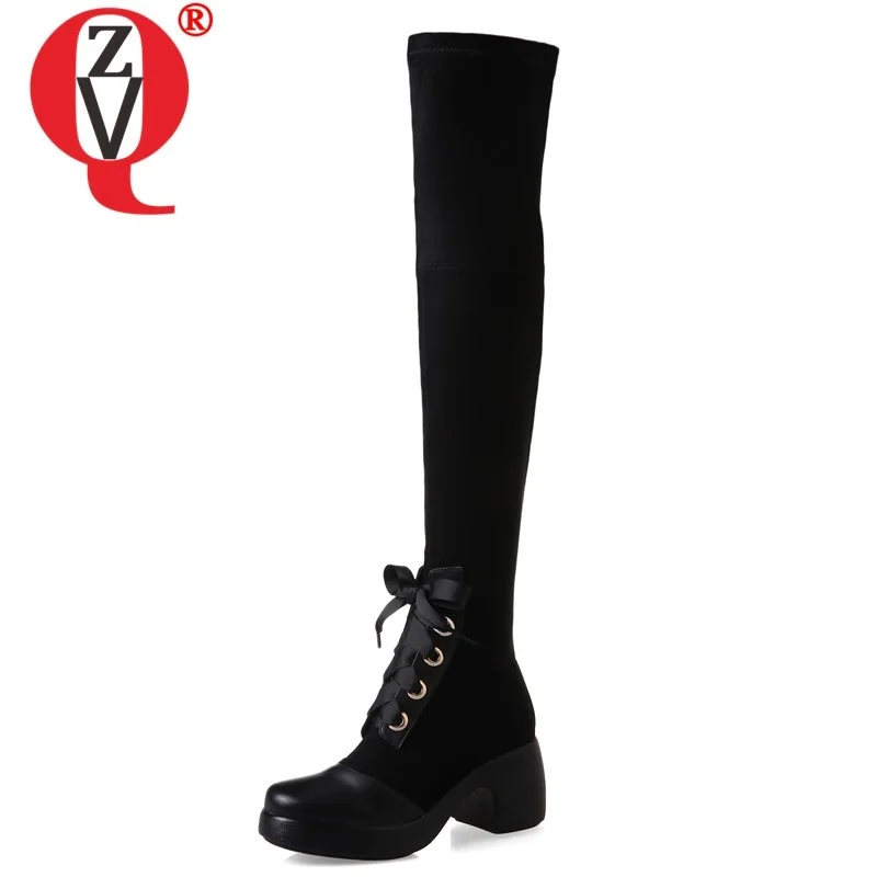 Special Offer ZVQ Новые модные зимние сапоги выше колена удобная женская обувь на высоком каблуке с перекрестной шнуровкой и круглым носком Прямая доставк... Discount 45% Today!
