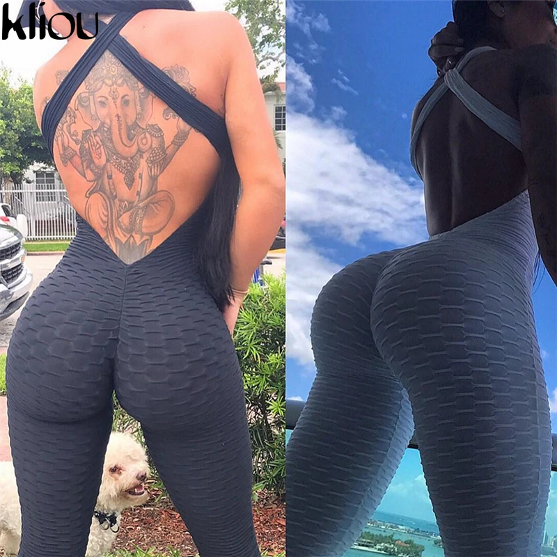 . [Скидка 50%] Купить Kliou Новый женский летний эластичный модный длинный сексуальный боди комбинезон с открытой спиной с перекрещенными бретелями спортивный ко... Цена Дешево.